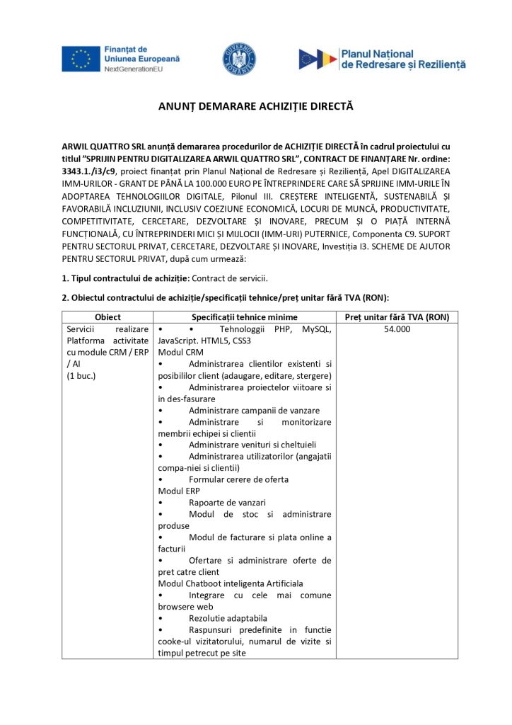 ARWIL QUATTRO SRL anunță demararea procedurilor de ACHIZIȚIE DIRECTĂ în cadrul proiectului cu titlul ”SPRIJIN PENTRU DIGITALIZAREA ARWIL QUATTRO SRL”, CONTRACT DE FINANȚARE Nr. ordine: 3343.1./i3/c9, Servicii realizare Platforma activitate cu module CRM / ERP / AI (1 buc.) Servicii realizare 2 retele sociale (1 buc.) Servicii de tip Cloud Computing (1 buc.)