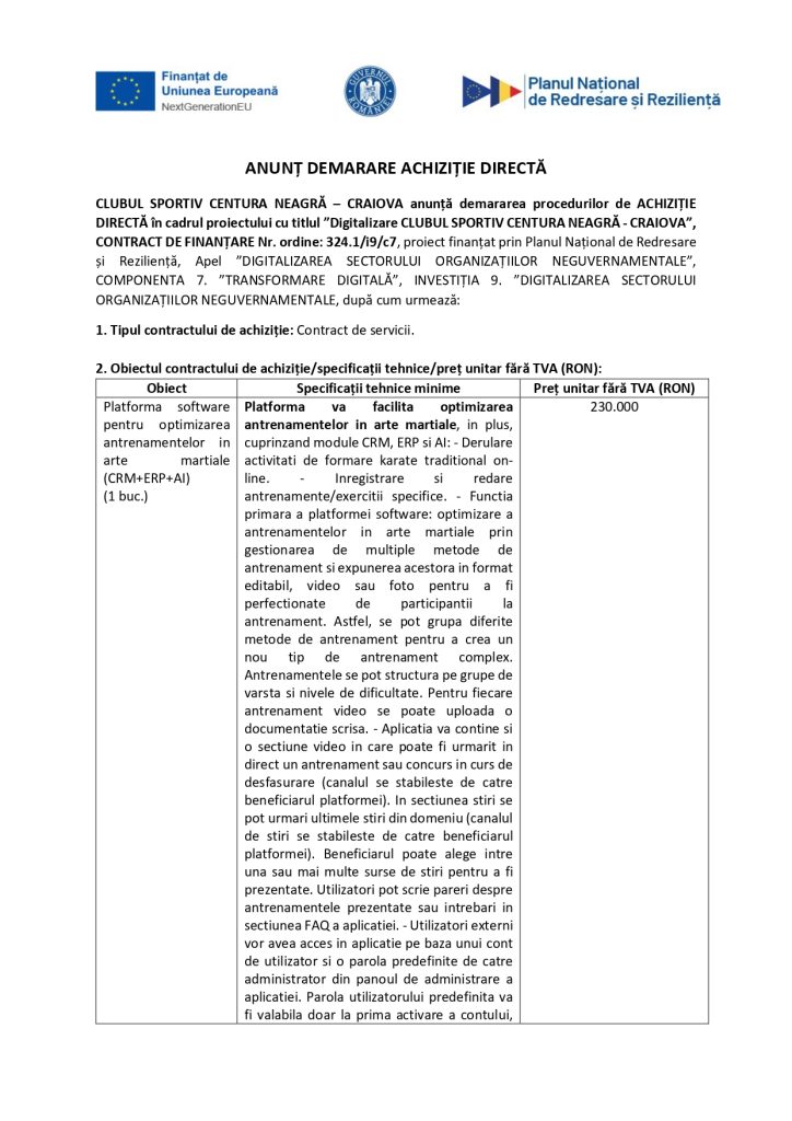 CLUBUL SPORTIV CENTURA NEAGRĂ – CRAIOVA anunță demararea procedurilor de ACHIZIȚIE DIRECTĂ în cadrul proiectului cu titlul ”Digitalizare CLUBUL SPORTIV CENTURA NEAGRĂ – CRAIOVA”, CONTRACT DE FINANȚARE Nr. ordine: 324.1/i9/c7, hard si soft