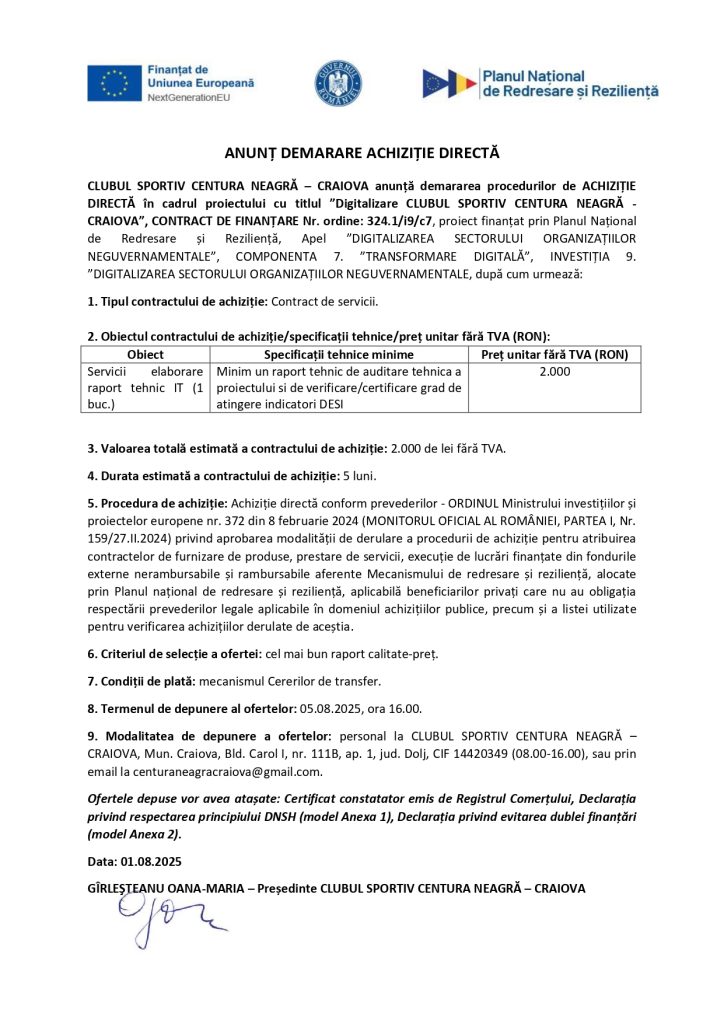 CLUBUL SPORTIV CENTURA NEAGRĂ – CRAIOVA anunță demararea procedurilor de ACHIZIȚIE DIRECTĂ în cadrul proiectului cu titlul ”Digitalizare CLUBUL SPORTIV CENTURA NEAGRĂ – CRAIOVA”, CONTRACT DE FINANȚARE Nr. ordine: 324.1/i9/c7, Servicii elaborare raport tehnic IT (1 buc.)