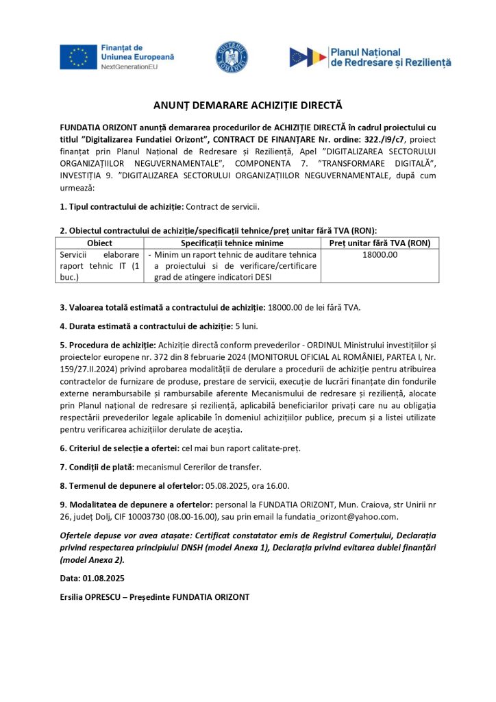 FUNDATIA ORIZONT anunță demararea procedurilor de ACHIZIȚIE DIRECTĂ în cadrul proiectului cu titlul ”Digitalizarea Fundatiei Orizont”, CONTRACT DE FINANȚARE Nr. ordine: 322./i9/c7, Servicii elaborare raport tehnic IT (1 buc.)