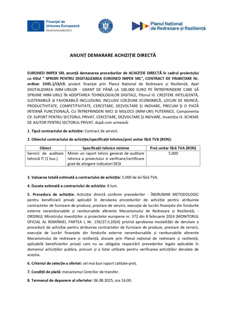 EURONED IMPEX SRL anunță demararea procedurilor de ACHIZIȚIE DIRECTĂ în cadrul proiectului cu titlul ”SPRIJIN PENTRU DIGITALIZAREA EURONED IMPEX SRL”, CONTRACT DE FINANȚARE Nr. ordine: 3345.1/i3/c9, Servicii de auditare tehnică IT (1 buc.)