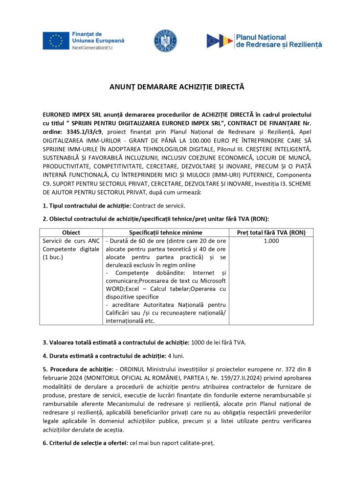 EURONED IMPEX SRL anunță demararea procedurilor de ACHIZIȚIE DIRECTĂ în cadrul proiectului cu titlul ”SPRIJIN PENTRU DIGITALIZAREA EURONED IMPEX SRL”, CONTRACT DE FINANȚARE Nr. ordine: 3345.1/i3/c9, Servicii de curs ANC Competente digitale (1 buc.)