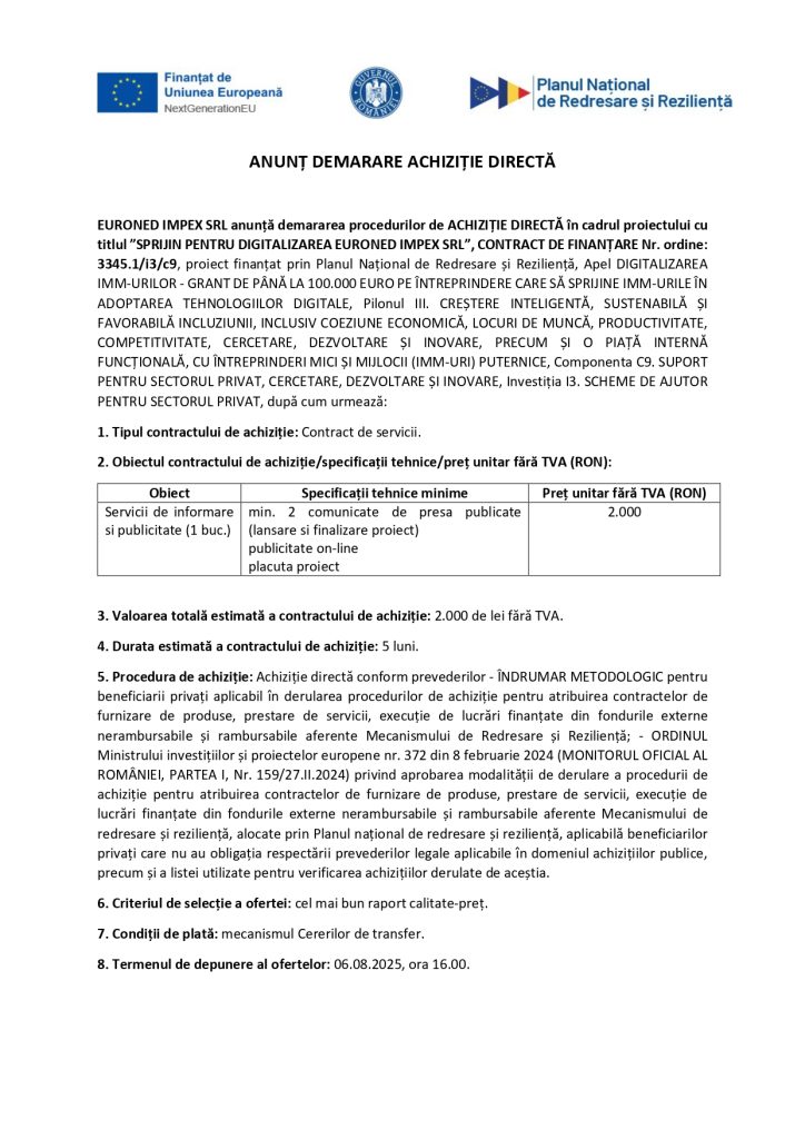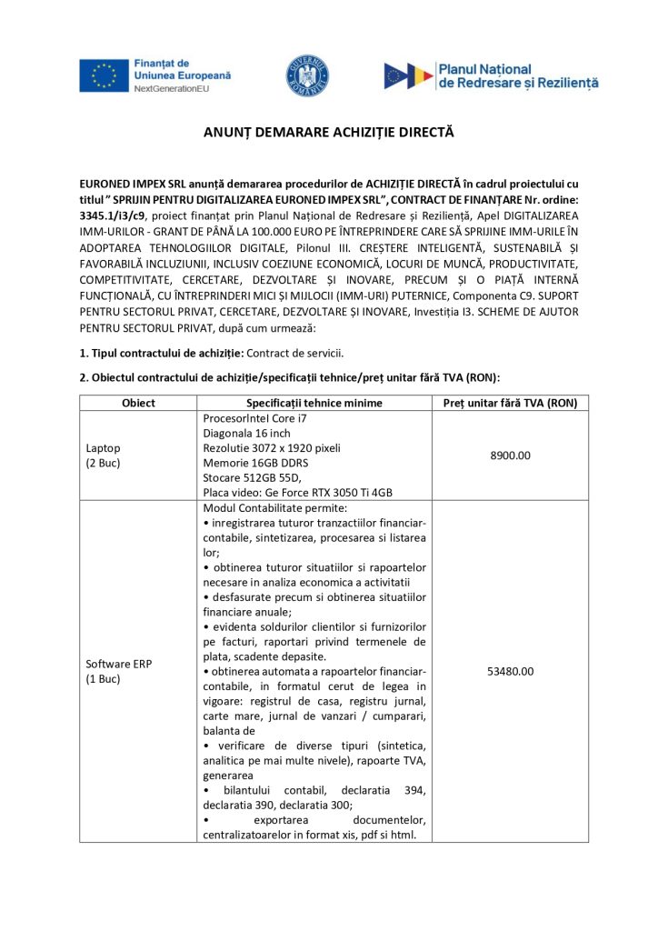 EURONED IMPEX SRL anunță demararea procedurilor de ACHIZIȚIE DIRECTĂ în cadrul proiectului cu titlul ”SPRIJIN PENTRU DIGITALIZAREA EURONED IMPEX SRL”, CONTRACT DE FINANȚARE Nr. ordine: 3345.1/i3/c9, Laptop (2 Buc) Software ERP (1 Buc) Software CRM (1 Buc) Pachet Office 365 (1 Buc) Site de prezentare (1 Buc) Servicii de tip Cloud Computing (1 Buc)