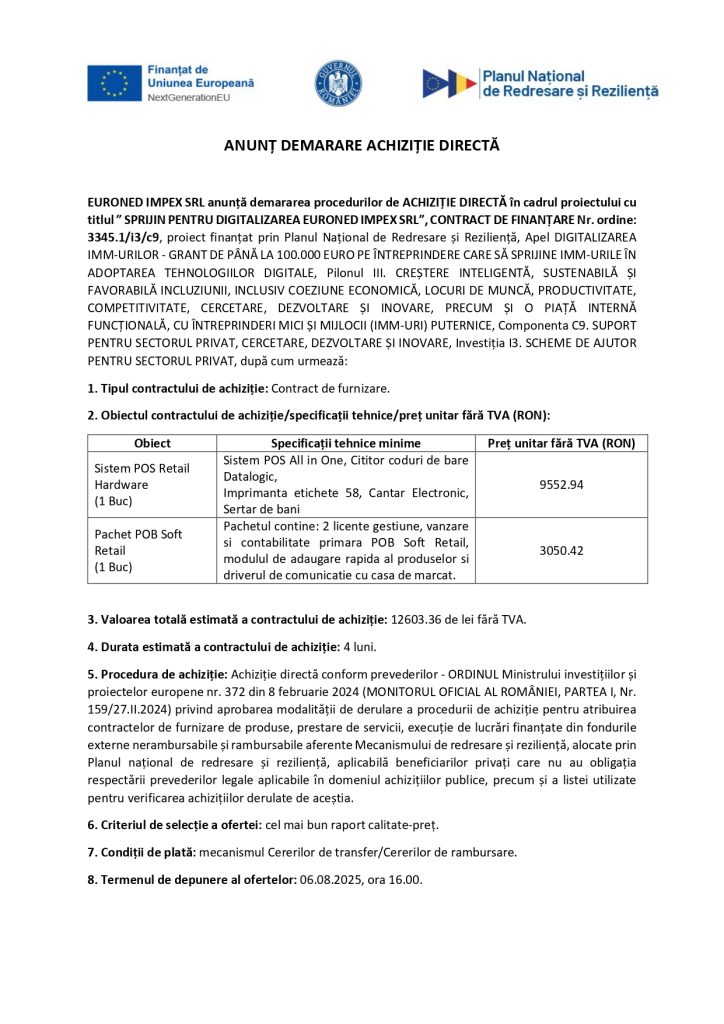 EURONED IMPEX SRL anunță demararea procedurilor de ACHIZIȚIE DIRECTĂ în cadrul proiectului cu titlul ”SPRIJIN PENTRU DIGITALIZAREA EURONED IMPEX SRL”, CONTRACT DE FINANȚARE Nr. ordine: 3345.1/i3/c9, Sistem POS Retail Hardware (1 Buc) Pachet POB Soft Retail (1 Buc)