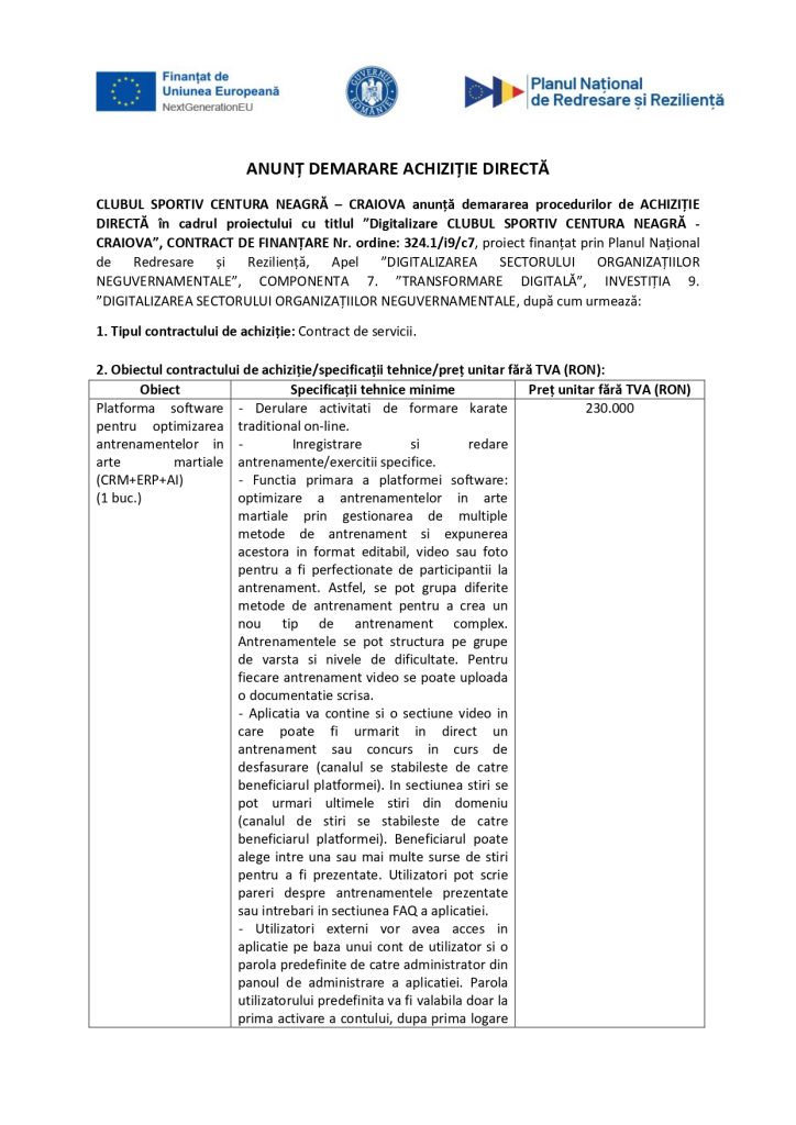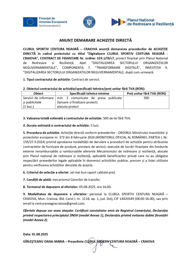 CLUBUL SPORTIV CENTURA NEAGRĂ – CRAIOVA anunță demararea procedurilor de ACHIZIȚIE DIRECTĂ în cadrul proiectului cu titlul ”Digitalizare CLUBUL SPORTIV CENTURA NEAGRĂ – CRAIOVA”, CONTRACT DE FINANȚARE Nr. ordine: 324.1/i9/c7, Servicii de informare și publicitate (1 buc.)
