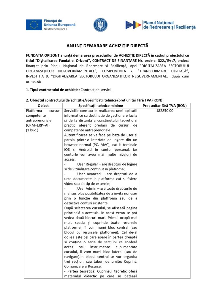 FUNDATIA ORIZONT anunță demararea procedurilor de ACHIZIȚIE DIRECTĂ în cadrul proiectului cu titlul ”Digitalizarea Fundatiei Orizont”, CONTRACT DE FINANȚARE Nr. ordine: 322./i9/c7, Platforma cursuri competente antreprenoriale (CRM+ERP+AI) (1 buc.) Servicii de dezvoltare aferente unui website (1 buc.) Servicii cloud computing sofisticate sau intermediare (1 buc.) Servicii de cloud computing utilizate pe internet (1 buc.) Servicii realizare 2 retele sociale (1 buc.) Termostat digital wireless (1 buc.)