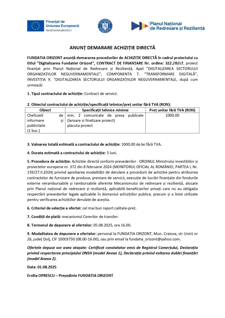 FUNDATIA ORIZONT anunță demararea procedurilor de ACHIZIȚIE DIRECTĂ în cadrul proiectului cu titlul ”Digitalizarea Fundatiei Orizont”, CONTRACT DE FINANȚARE Nr. ordine: 322./i9/c7, Cheltuieli de informare și publicitate (1 buc.)