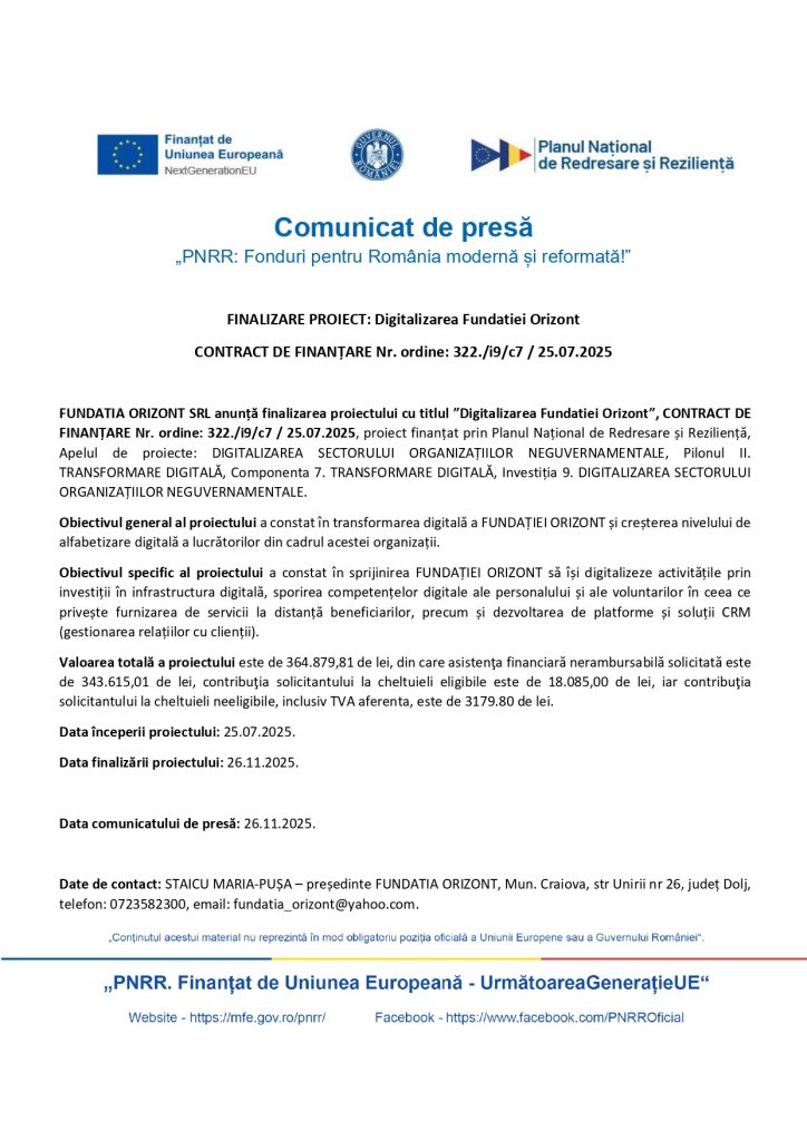 FUNDATIA ORIZONT SRL anunță finalizarea proiectului cu titlul ”Digitalizarea Fundatiei Orizont”, CONTRACT DE FINANȚARE Nr. ordine: 322./i9/c7 / 25.07.2025