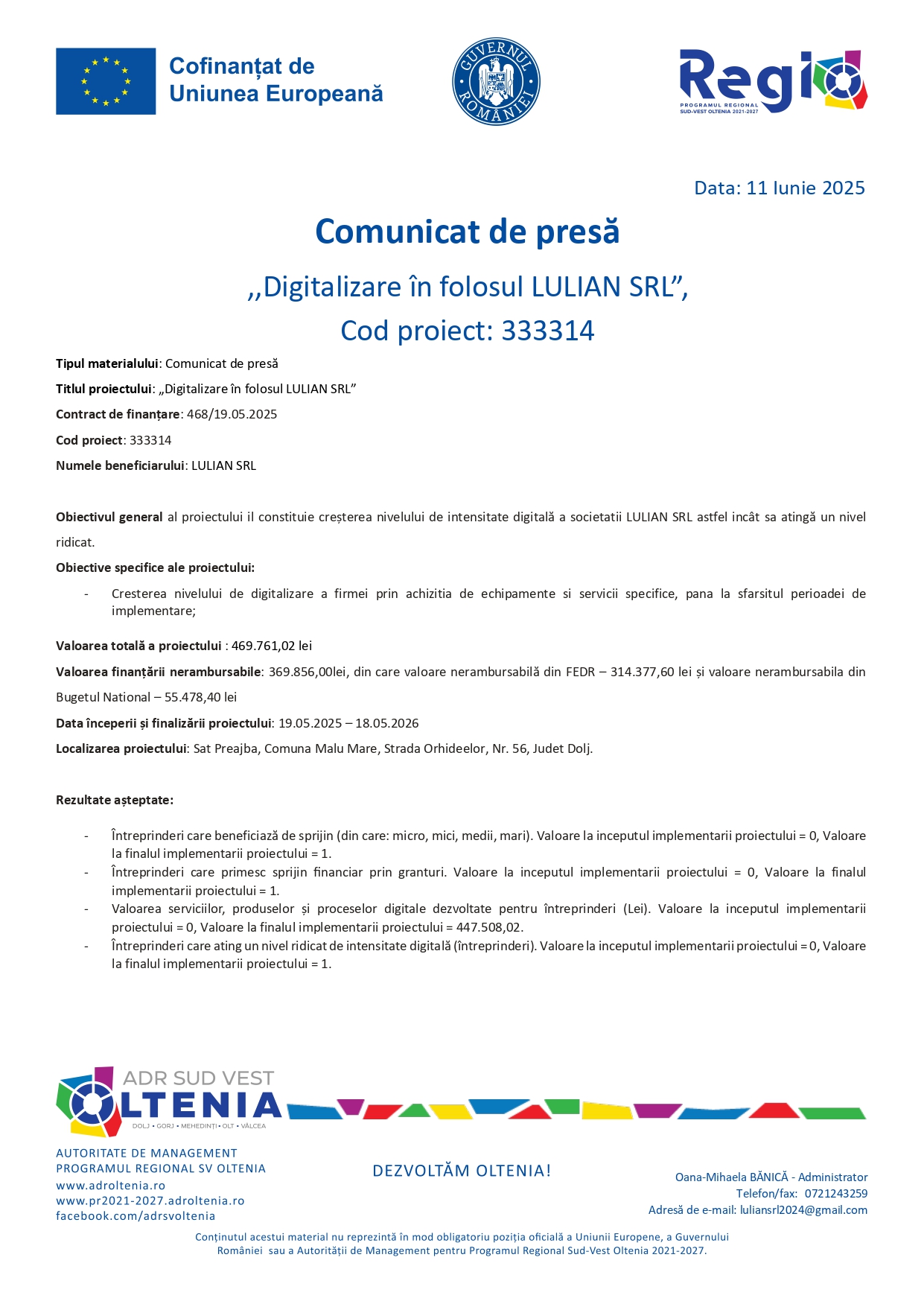 LULIAN SRL anunță lansarea proiectului cu titlul ,,Digitalizare în folosul LULIAN SRL”, Cod proiect: 333314