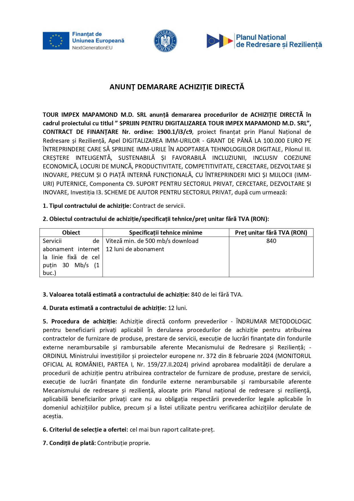TOUR IMPEX MAPAMOND M.D. SRL anunță demararea procedurilor de ACHIZIȚIE DIRECTĂ în cadrul proiectului cu titlul ” SPRIJIN PENTRU DIGITALIZAREA TOUR IMPEX MAPAMOND M.D. SRL”, CONTRACT DE FINANȚARE Nr. ordine: 1900.1/i3/c9, Servicii de abonament internet la linie fixă de cel puțin 30 Mb/s (1 buc.)