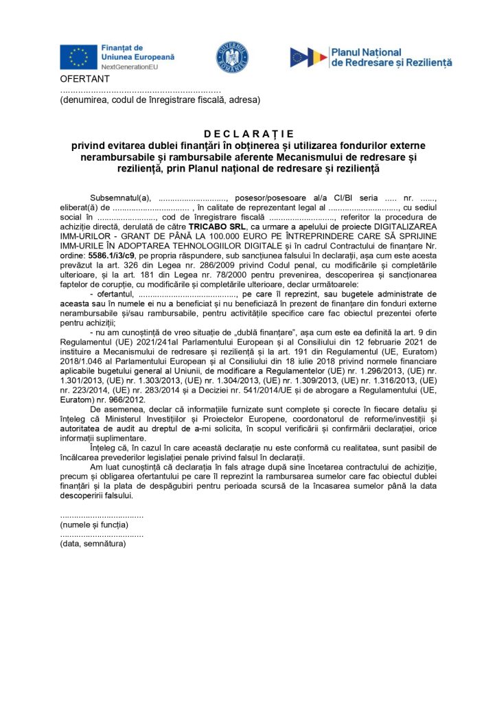TRICABO SRL anunță demararea procedurilor de ACHIZIȚIE DIRECTĂ în cadrul proiectului cu titlul ”Digitalizare TRICABO SRL”, CONTRACT DE FINANȚARE Nr. ordine: 5586.1/i3/c9, Audit DESI (1 buc.)