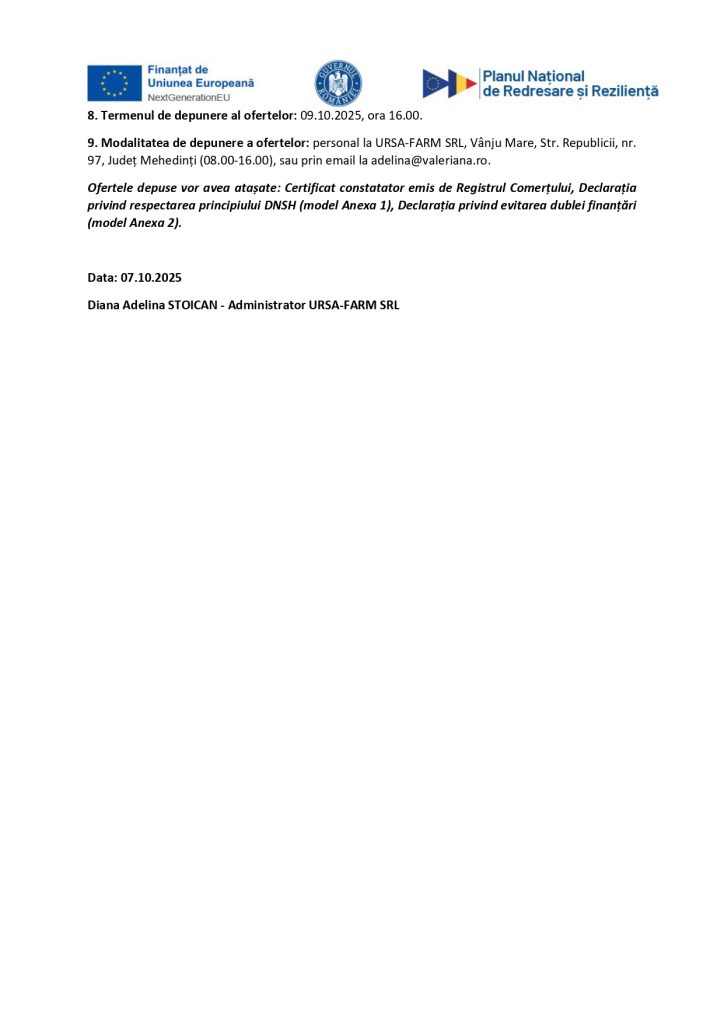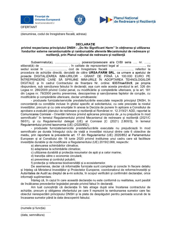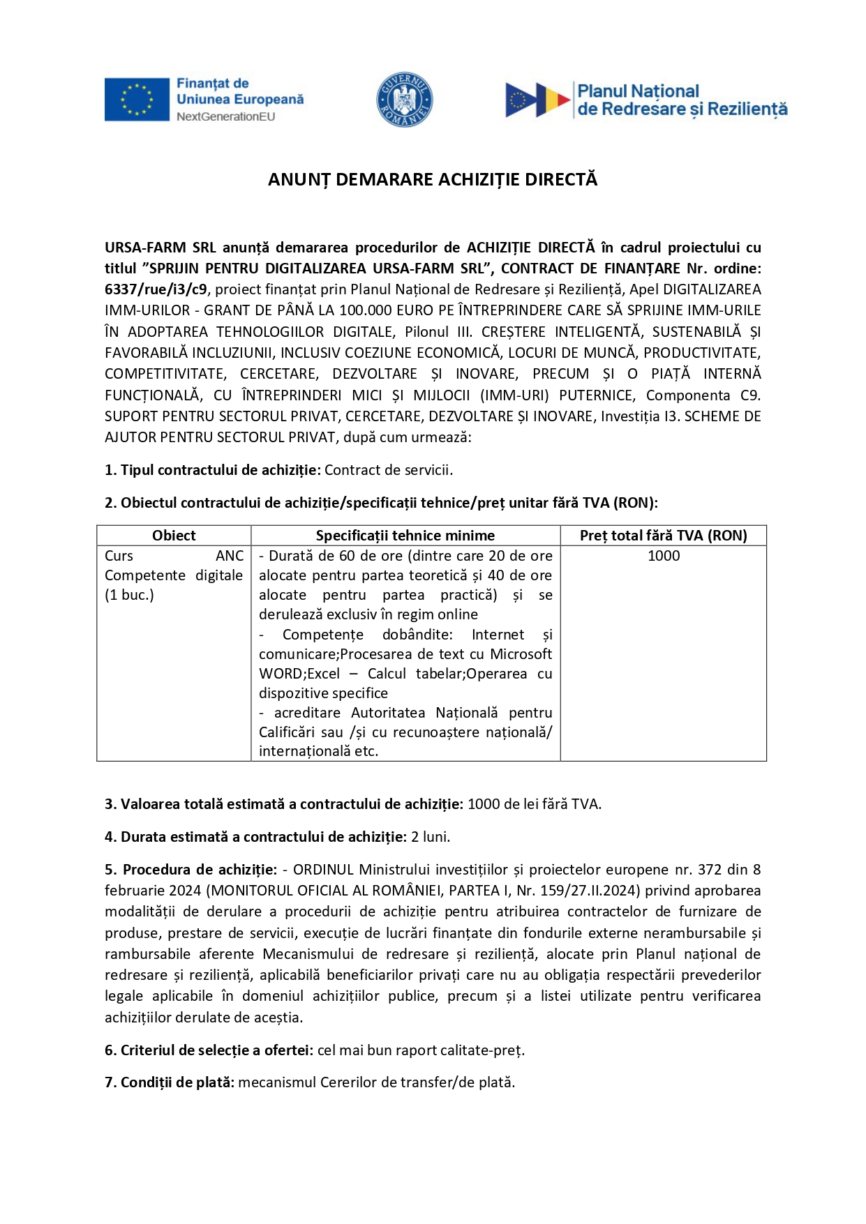 URSA-FARM SRL anunță demararea procedurilor de ACHIZIȚIE DIRECTĂ în cadrul proiectului cu titlul ”SPRIJIN PENTRU DIGITALIZAREA URSA-FARM SRL”, CONTRACT DE FINANȚARE Nr. ordine: 6337/rue/i3/c9, Curs ANC Competente digitale (1 buc.)
